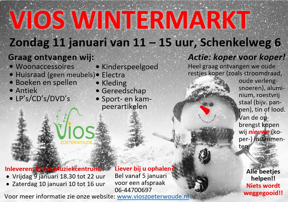 Een paar keer per jaar organiseert VIOS een markt in het muziekcentrum in Zoeterwoude. Op deze manier proberen wij geld te verdienen voor onze club. We kunnen zo speciale projecten financieren, bladmuziek en instrumenten kopen en onderhouden.